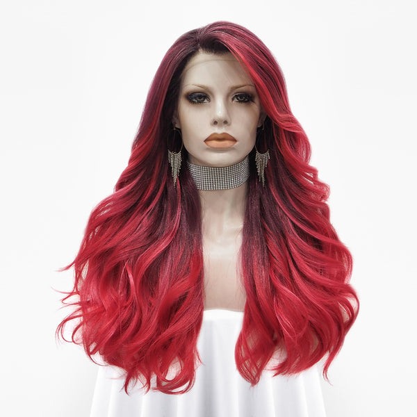 Rose - Wine Red With Dark Root Long Wavy Synthetic Lace Front Wig