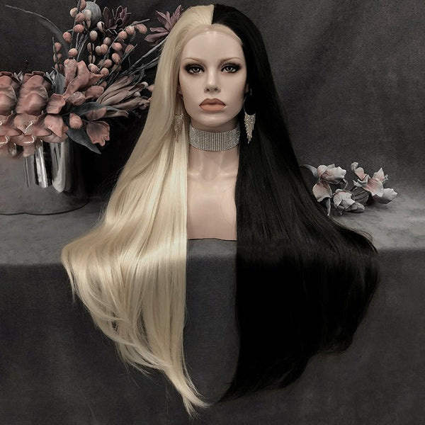 Half Black Half Blonde Wigs Long Straight Synthetic Wig