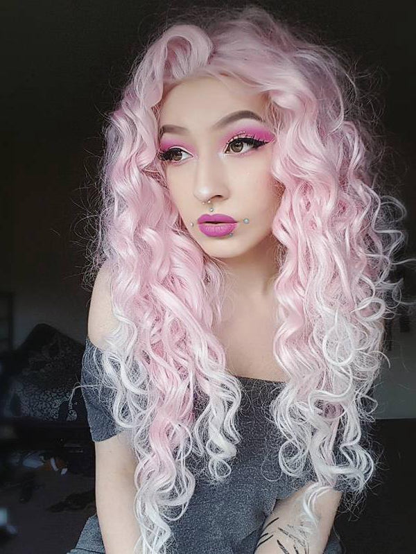 Pink Mixed White Two Tone Color Curly Lace Front Synthetic Wig - Imstylewigs