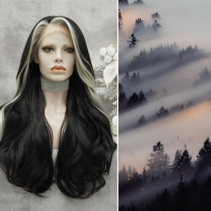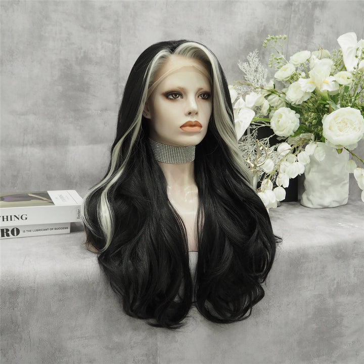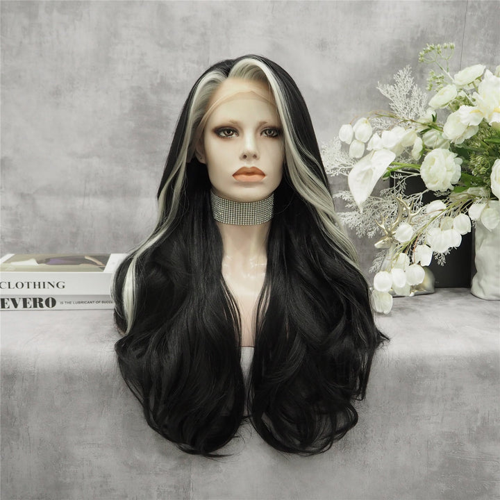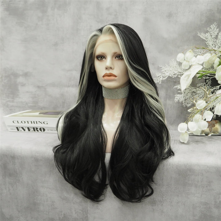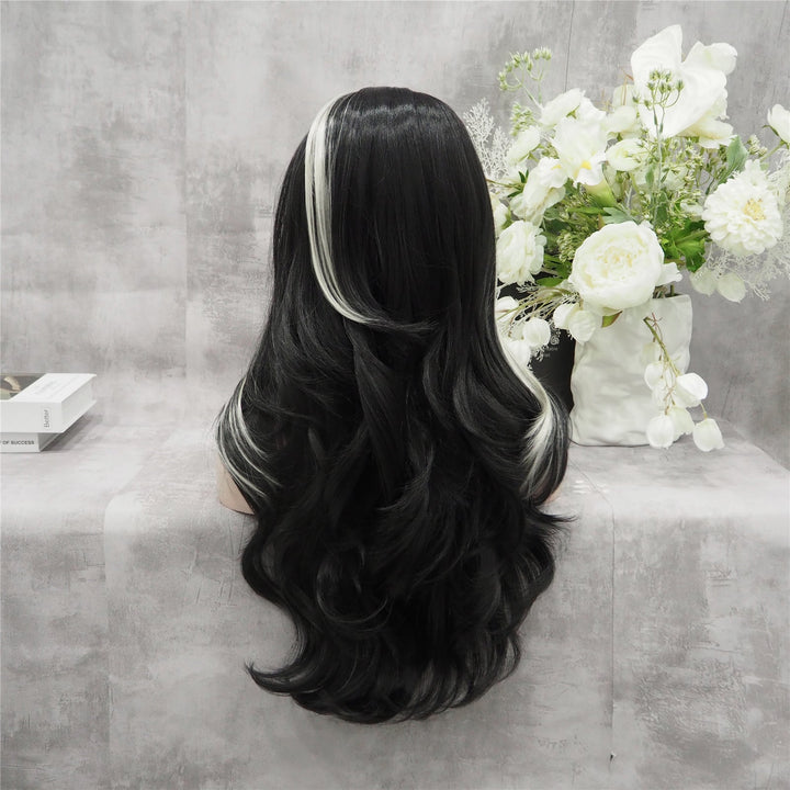 Morticia Black With White Highlights Long Wave Synthetic Lace Front Imstyle Wig