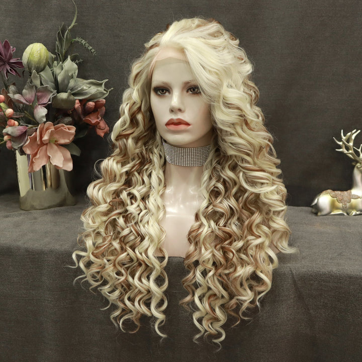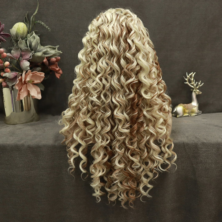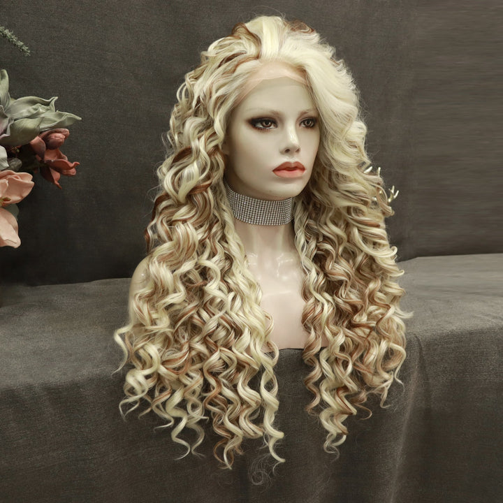 This Blonde Highlights Curly Lace Front Synthetic Wig has been cut into a classic style with long, curly layers, slimming any face shape and with lots of movement and flow. The lace frontal ensures the most realistic of looks with each strand appearing to grow naturally from the hairline. This Blonde Synthetic Lace Front Wig can put you in the spotlight and it is used for cosplay characters, Halloween costume, drag queen show, party and daily wear. You will get a big thumb up from your friends when you wear it.