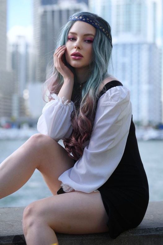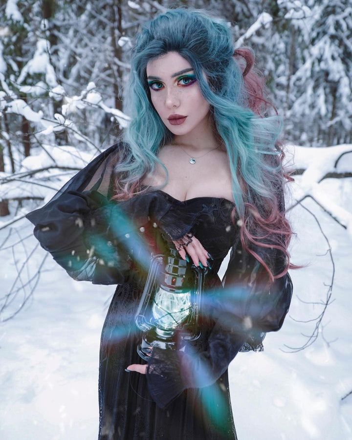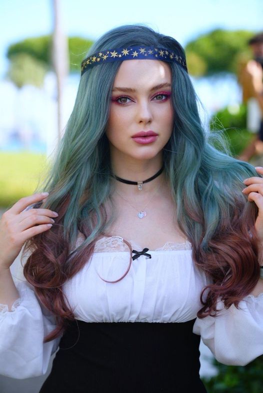 Cedar is a popular fragrance in perfume, we tride to express this delicate fragrance of pine trees in color. Cedar has been cut into a classic style with long, wavy layers. The shiny fluffy curls soften the green brown hue and will perfectly set off the makeup.