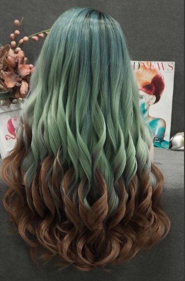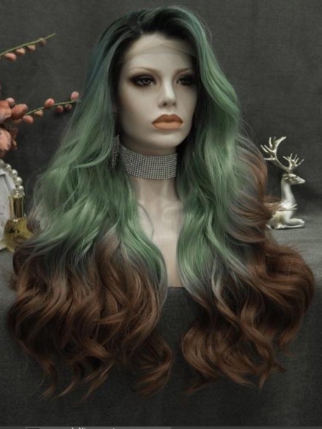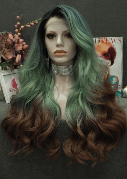 Cedre - Viridian Green And Brown Ombre Long Wavy Synthetic Lace Front Wig