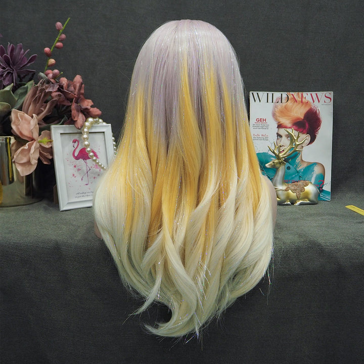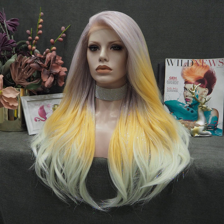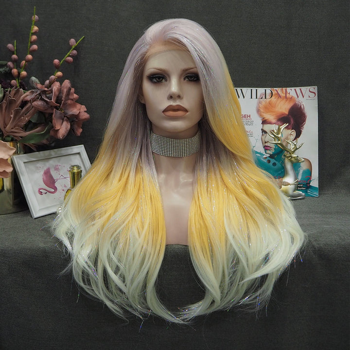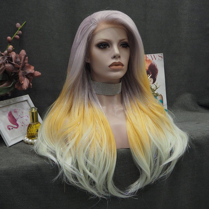 Demi - Light Pink to Blonde Cyan Ombre with Tinsel Long Straight Synthetic Lace Front Wig