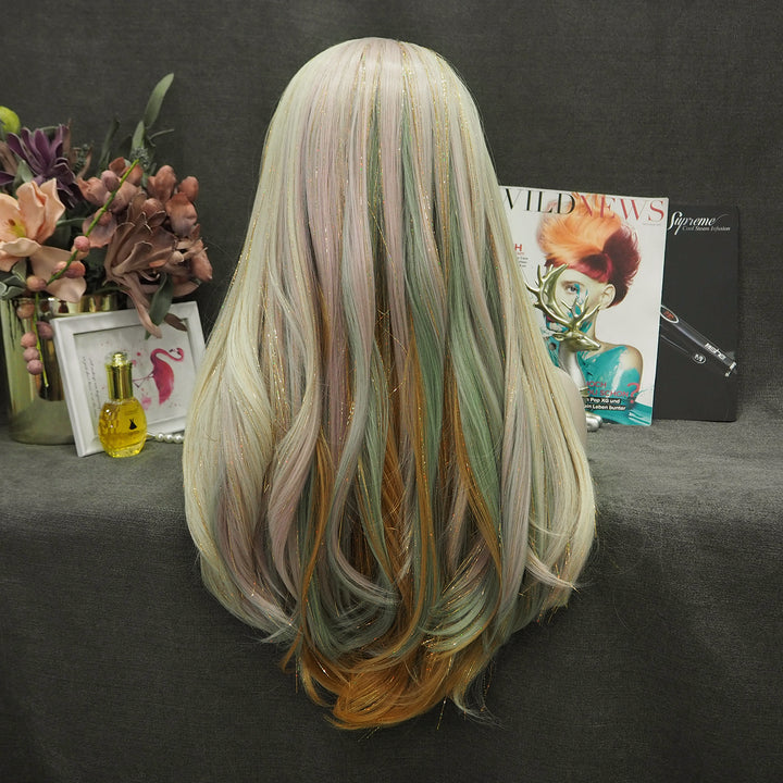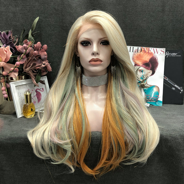 Gloria - Blonde-Light green & Deep Yellow Highlighted With Shiny Tinsel Synthetic Lace Front Wig