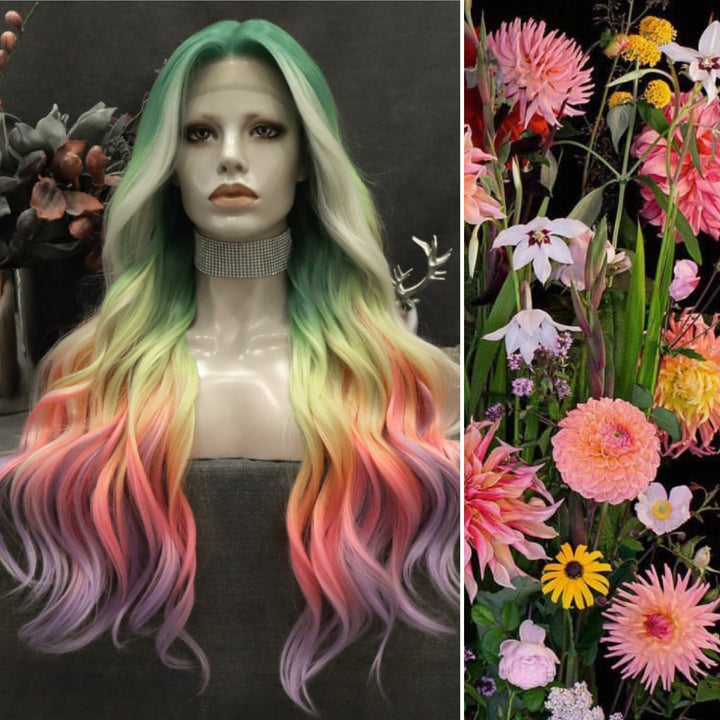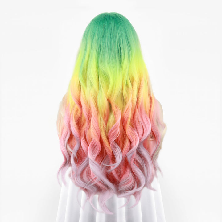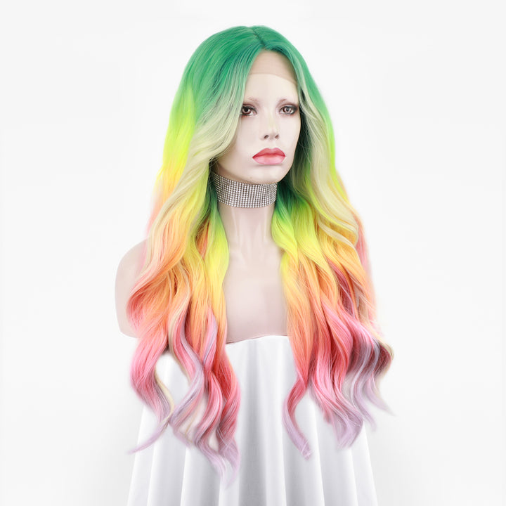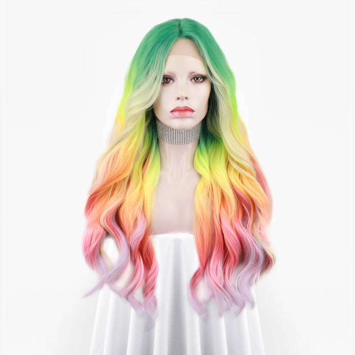 Heather-Gorgeous Rainbow Colorful long Water Wave Synthetic T Part Lace Front Wig