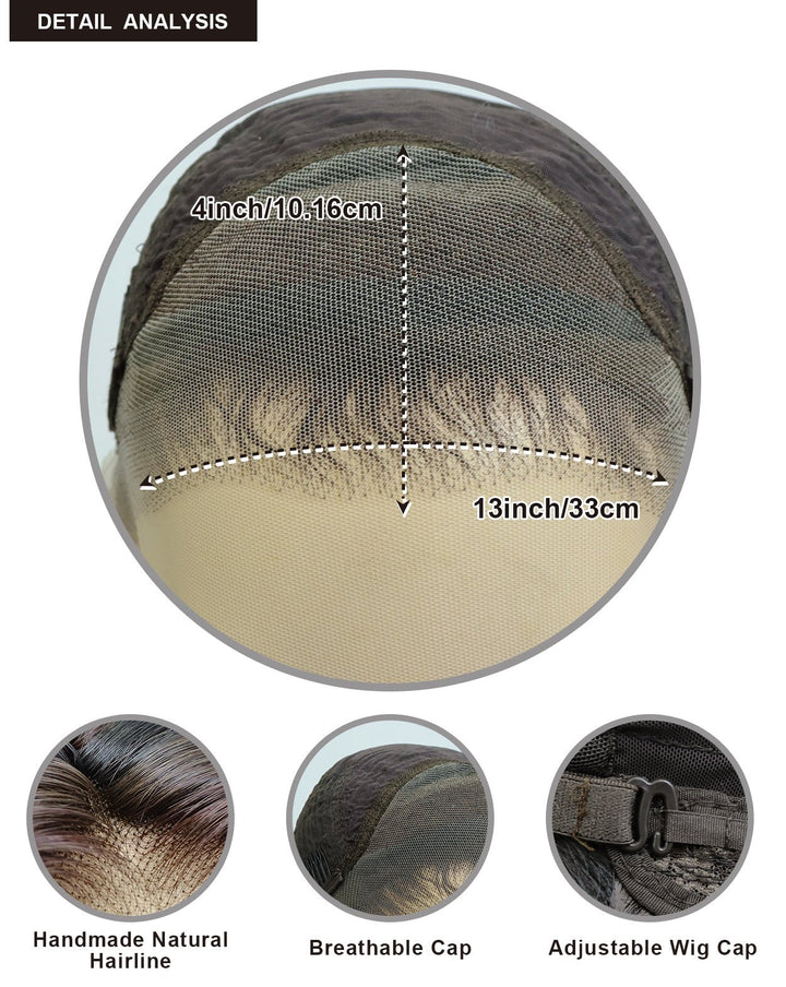 - Cap Design: hand-tied lace frontal. Fully adjustable elastic strap to the rear. 3 hair combs for added security. Simply tuck in or cut away the extra lace around the hairline.