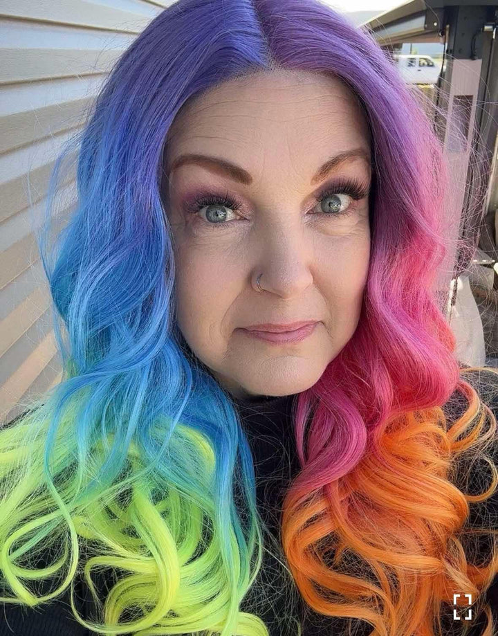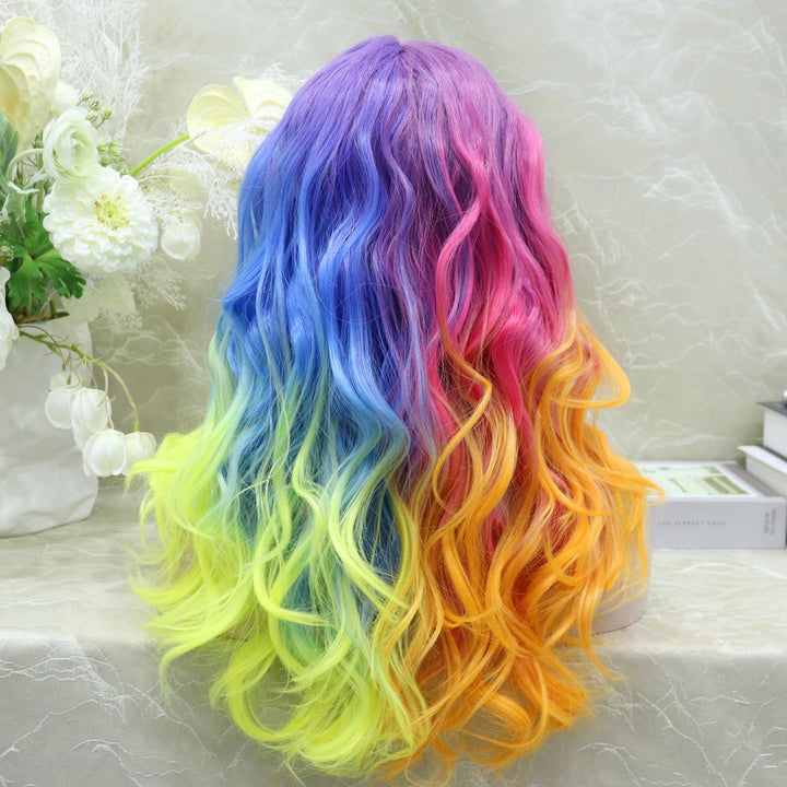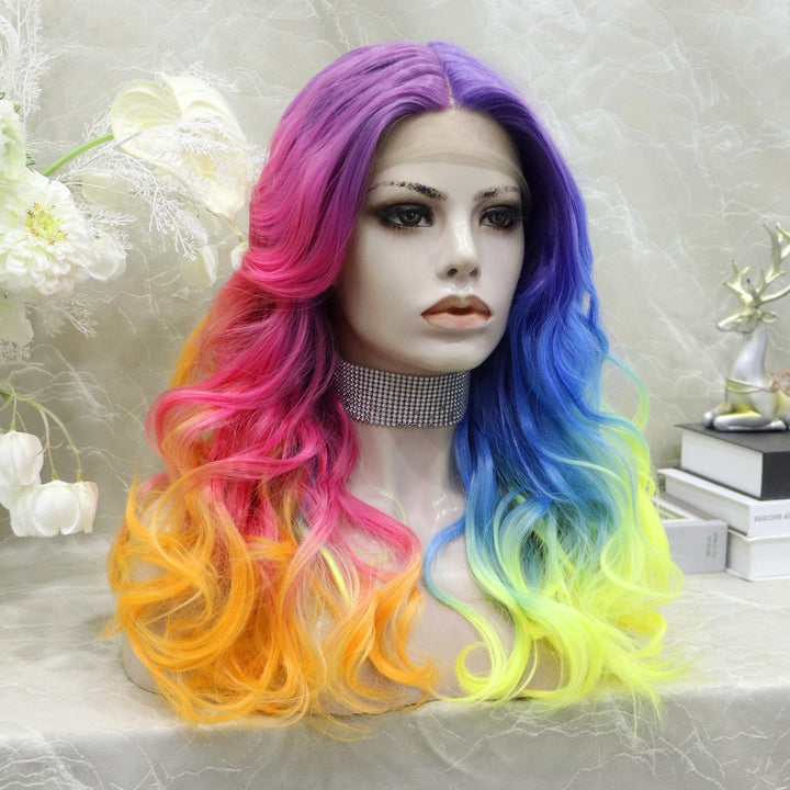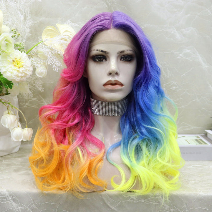 Brenda Collection-Dazzling Rainbow colorful wigs with 22inches wavy style T-part lace front synthetic wigs heat friendly