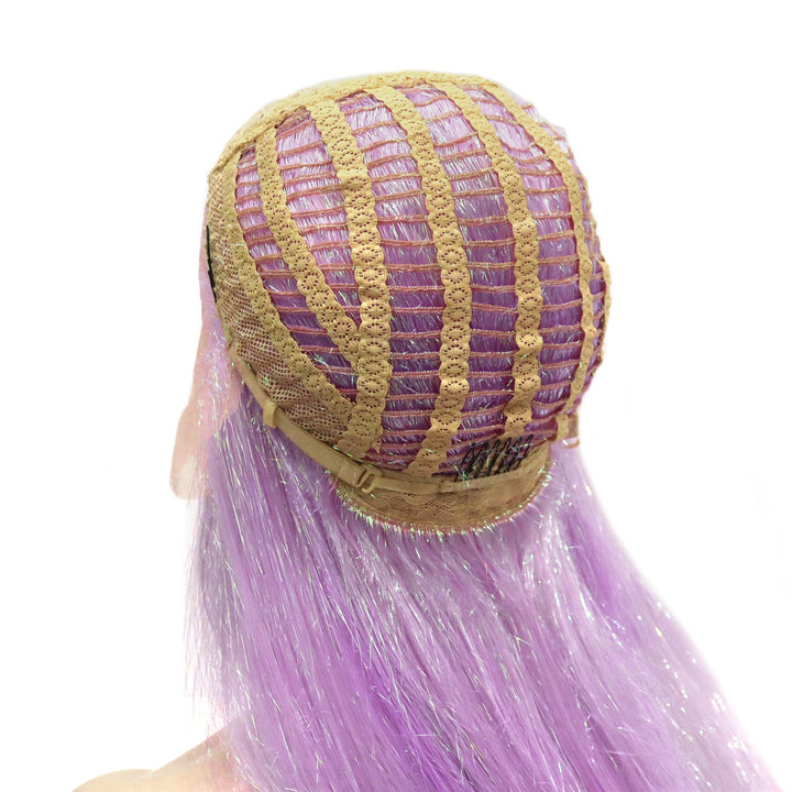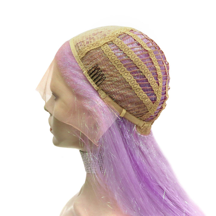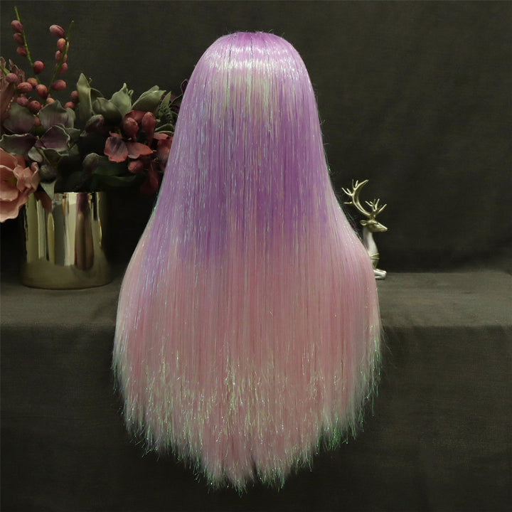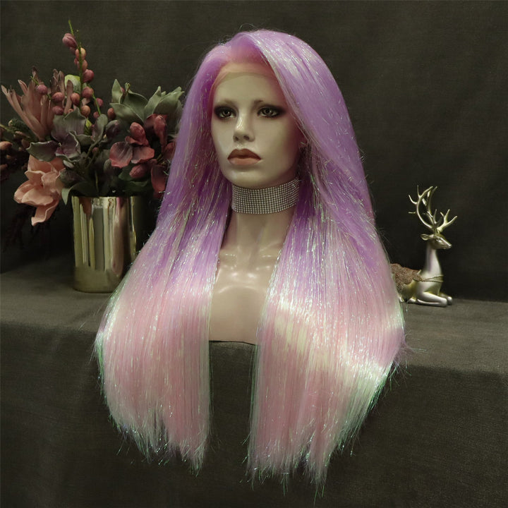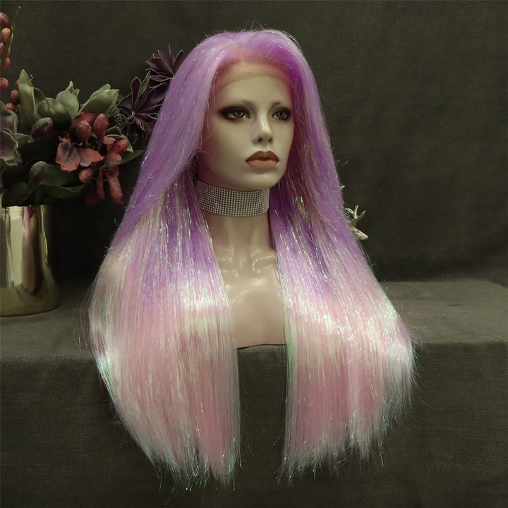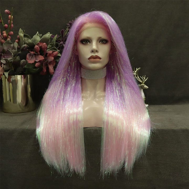 Pink Ombre Tinsel With Synthetic Long Straight Lace Front Costume Party Wig