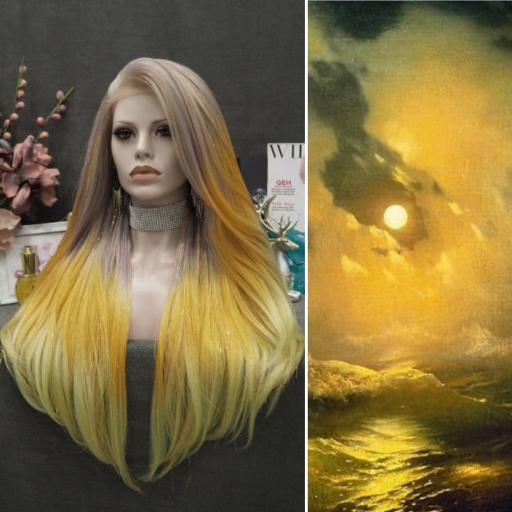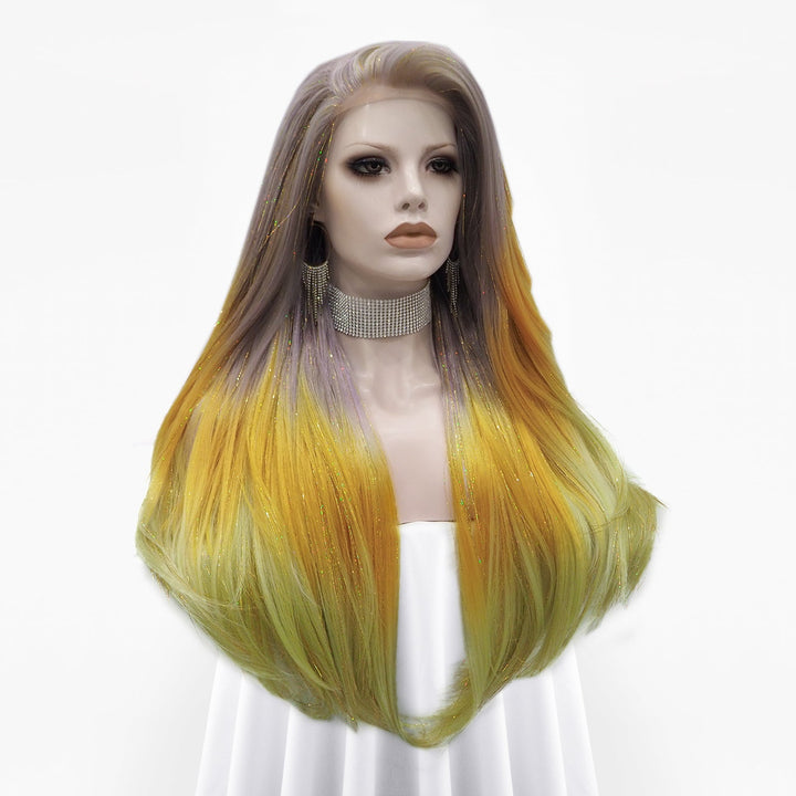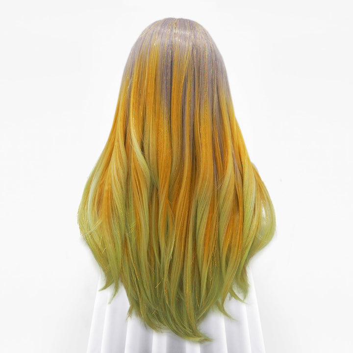 Light Red to Blonde Green Ombre with Tinsel Long Straight Synthetic Lace Front Wig