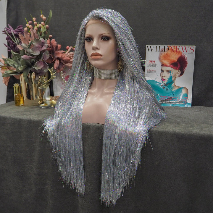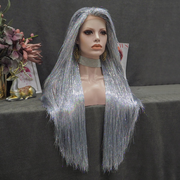 Sandy - Silver Gray White Full Tinsel Long Straight Wig